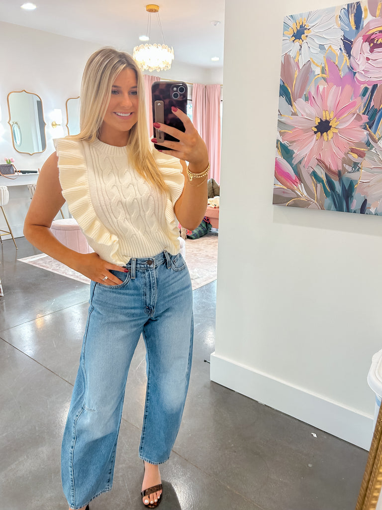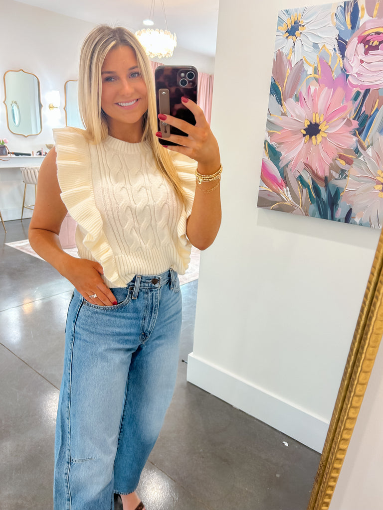 Cozy Couture Ivory Cable Knit Sweater Vest W/ Ruffles
